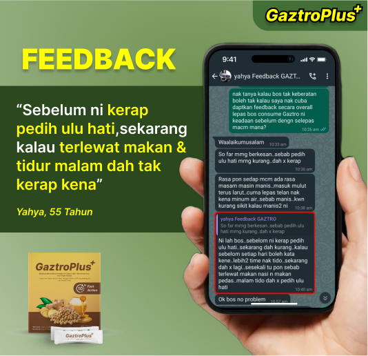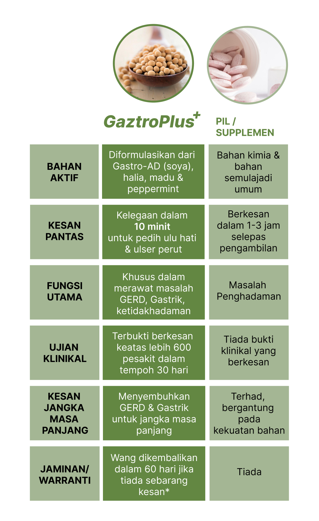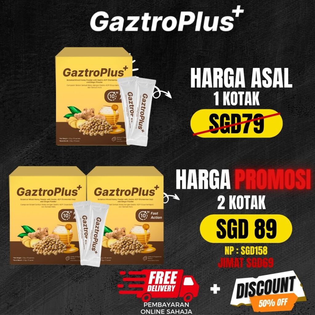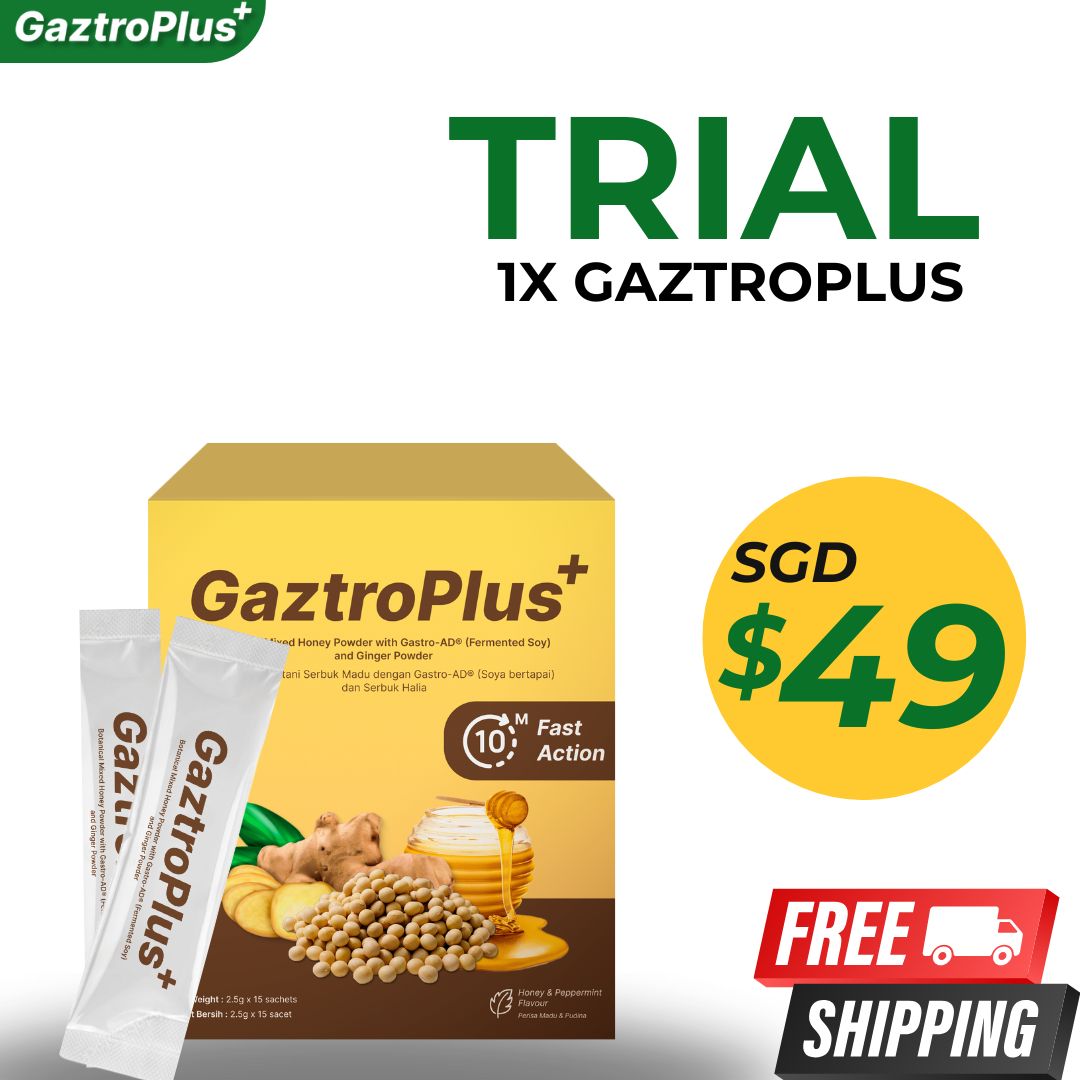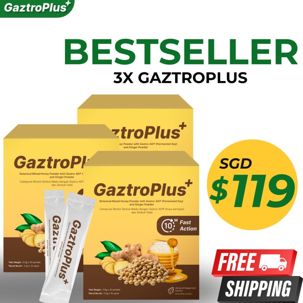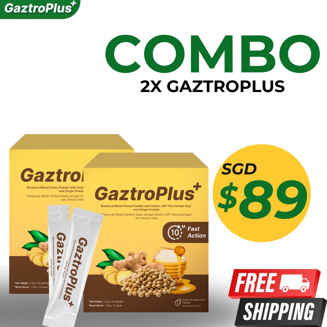 Gaztroplus adalah supplemen yang diformulasikan dari Gastro-AD®(berasaskan soya asli bukan GMO yang diperam dengan Probiotik), Madu & Pudina yang berfungsi secara efektif dalam menangani masalah GERD, Gastrik dan angin dalam badan. Kandungan ini membantu dengan pantas mengurangkan simptom seperti pedih ulu hati, serangan gastrik, sesak nafas, rasa nak muntah serta mempercepatkan proses penyembuhan.Gaztroplus alternatif semulajadi, selamat, dan terbukti berkesan berbanding ubat-ubatan.